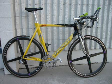 - dead (dropout broke, August 2012) - SOLD w/o wheels tt bike - looks like a 2000 Specialized Allez Pro M4 frame (58cm), was free to me because of a ding in the downtube (I got connections), yellow/black, was using old 8-sp STI shifters and rear derailleur from croaked Eddy, my spare set of old DA Look pedals, my 10-year-old Scott Lemond II aero bars, an old fork I got from Rob for $20, the Avocet 45 that used to be on the mountain bike (with a new battery), Jay's Ionic cranks, and some stuff Will and Ed found around the shop (pre-STI 600 front derailleur, Suntour Superbe calipers, random Tange headset, random bars, stem, seat, and seatpost) - oh, and Will's old Spinergys that he was nice enough to sell me.
