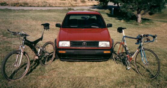 - '96 Trek Y-22 - Now with saggy 2nd shock, reason to get some Sugar (above) - but pressed into occasional service as commuter bike when other bikes break. Back in '99, went for some new components. Size large,
