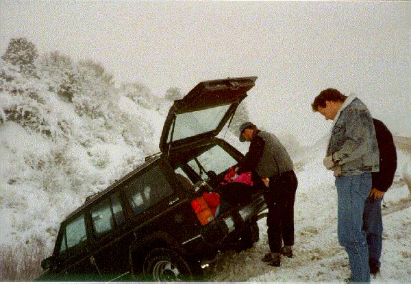 Here is Peter's Jeep at an unnatural angle. I am buttoning my jacket because it's cold and windy and snowy. There's something about Utah and snowstorms...
